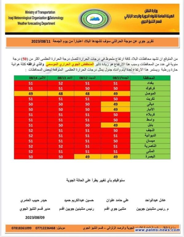 الأنواء الجوية: البصرة تسجل نصف درجة الغليان و14 محافظة تتجاوز حرارتها الـ45 درجة