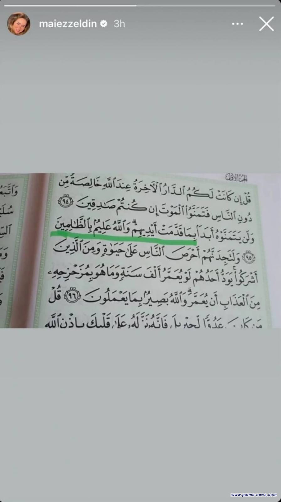 ونشرت مي عبر خاصية القصص المصورة الملحقة بحسابها الخاص في "إنستغرام" صورة لصفحة من القرآن الكريم، ووضعت خطاً تحت آية فيها تتحدث عن الظلم والظالمين، الأمر الذي دفع عدداً كبيراً من جمهورها للتساؤل عن المقصود في منشورها هذا، وهل تعرضت للظلم في الفترة الماضية، وكشف سبب غيابها طوال تلك الفترة.