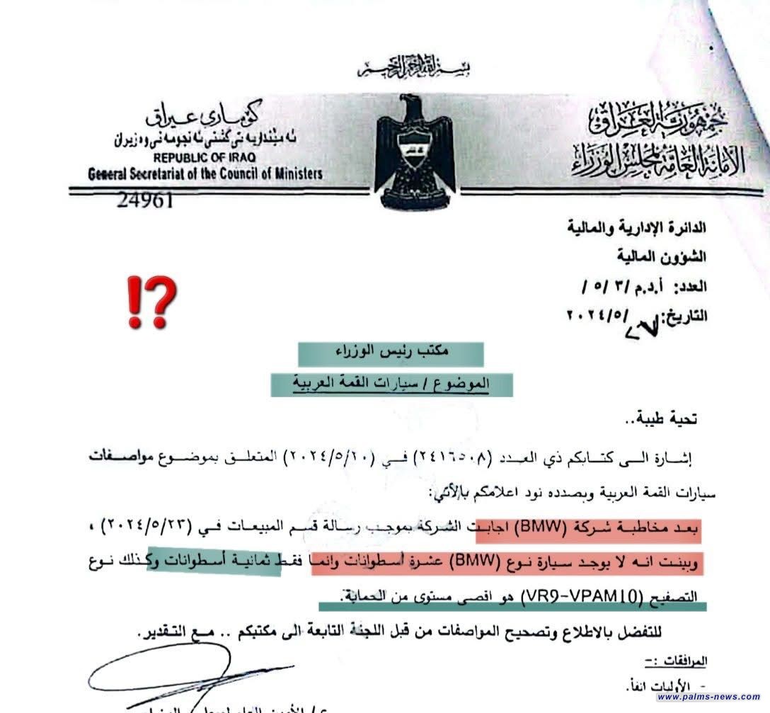 كشف النائب محمد جاسم الخفاجي، اليوم، عن وثيقة رسمية تتضمن رد شركة BMW على طلب تقدمت به الحكومة العراقية لتجهيز سيارات خاصة لاستخدامها خلال قمة بغداد التي انعقدت العام الماضي.