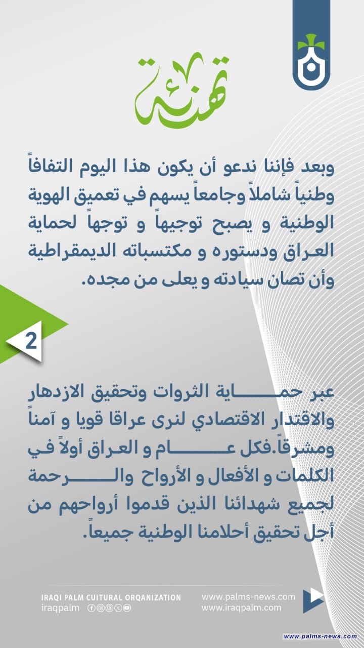 نخيل عراقي تهنئ بحلول اليوم الوطني العراقي : " ندعو أن يكون هذا اليوم التفافاً وطنياً شاملاً وجامعاً يسهم في تعميق الهوية الوطنية"