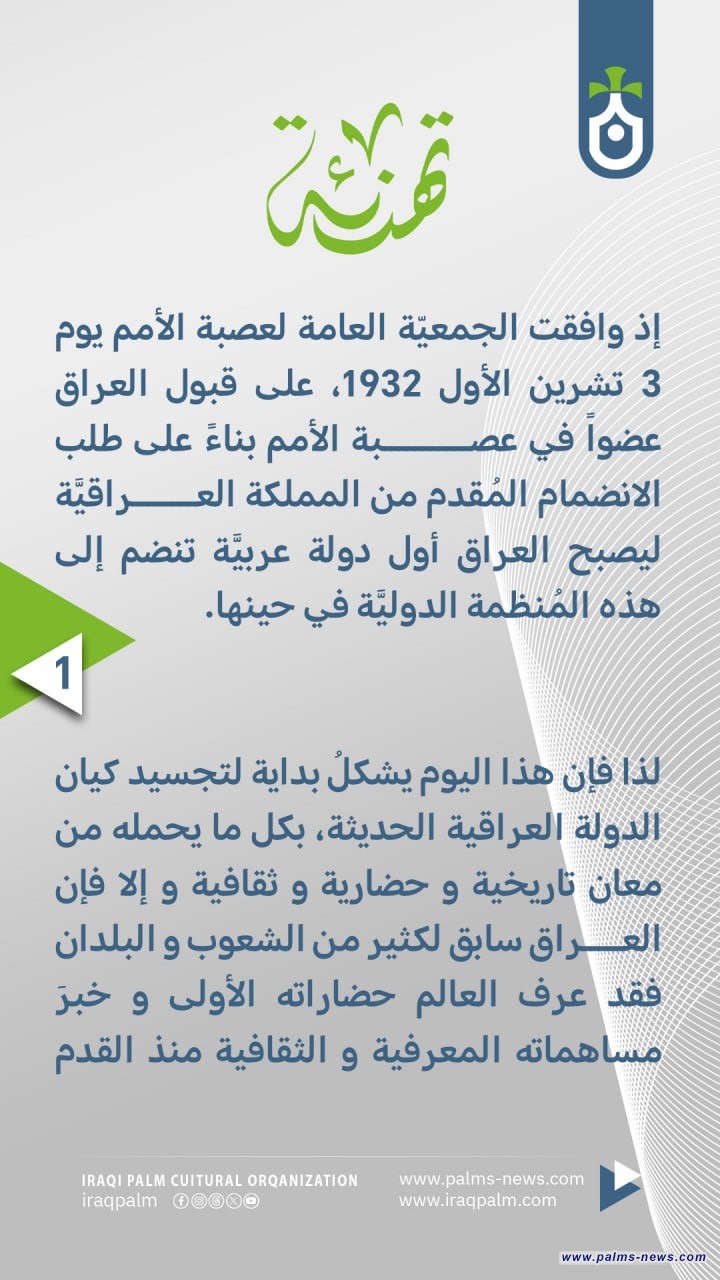 تتقدمُ مؤسسة نخيل عراقي متمثلةً برئيسها الشاعر و الإعلامي د. مجاهد أبو الهيل بأحر التهاني و التبريكات إلى جميع العراقيين في ربوع وطننا أو خارجه بمناسبة اليـوم الـوطني العراقـي الذي يوافـق ۳ تشريـن الأول مـن كل عام والذي يمثلُ الذكـرى ال٩٣ لعضوية عراقنا الحبيب في أعلى هيئة دولية معترفٌ بها.
