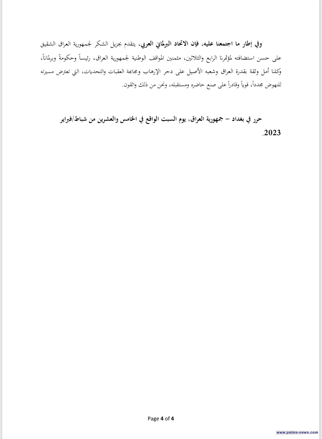 نخيل نيوز تنشر "إعلان بغداد" بعد اختتام مؤتمر اتحاد البرلمانات العربية