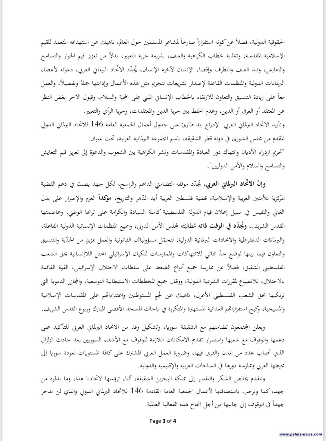 كما وأعلن الاتحاد البرلماني العربي، موقفه التضامني الداعم والراسخ، لكل جهد يصب في دعم القضية المركزية للأمتين العربية والإسلامية، قضية فلسطين العربية أبد الدهر ،والتاريخ، مؤكداً العزم والإصرار على بذل الغالي والنفيس في سبيل إعلان قيام الدولة الفلسطينية كاملة السيادة والكرامة على ترابها الوطني، وعاصمتها القدس الشريف، مجدداً في الوقت ذاته مطالبته لمجلس الأمن الدولي، وجميع المنظمات الإنسانية الدولية الفاعلة، والبرلمانات الديمقراطية والاتحادات البرلمانية الدولية، لتحمل مسؤولياتهم القانونية والعمل بمزيد من الجدية والتنسيق والتعاون فيما بينها لوضع حد نهائي للانتهاكات والممارسات للكيان الإسرائيلي المحتل اللا إنسانية بحق الشعب الفلسطيني الشقيق، فضلاً عن ممارسة جميع أنواع الضغط على سلطات الاحتلال الإسرائيلي، القوة القائمة بالاحتلال، للانصياع لمقررات الشرعية الدولية، ووقف جميع المخططات الاستيطانية التوسعية، والمجازر الدموية التي ترتكبها بحق الشعب الفلسطيني الأعزل، ناهيك عن لجميع المستوطنين واعتداءاتهم على المقدسات الإسلامية والمسيحية، وكبح استفزازاتهم العدائية المستهترة والمتكررة في باحات المسجد الأقصى المبارك وربوع القدس الشريف. من دعمها والوقوف مع شعبها واستمرار تقديم الامكانات اللازمة للوقوف مع الأشقاء السوريين بعد حادث الزلزال الذي أصاب عدد المدن والقرى فيها، وضرورة العمل العربي المشترك على كافة المستويات لعودة سوريا إلى محيطها العربي وممارسة دورها في الساحات العربية والإقليمية والدولية. ونتقدم بخالص الشكر والتقدير إلى مملكة البحرين الشقيقة، أثناء ترؤسها لاتحادنا هذا، وما بذلوه من جهد، كما وترحب باستضافتها لأعمال الجمعية العامة القادمة 146 للاتحاد البرلماني الدولي والذي لن تدخر جهداً في الوقوف إلى جانبها من أجل النجاح هذه الفعالية العالمية".