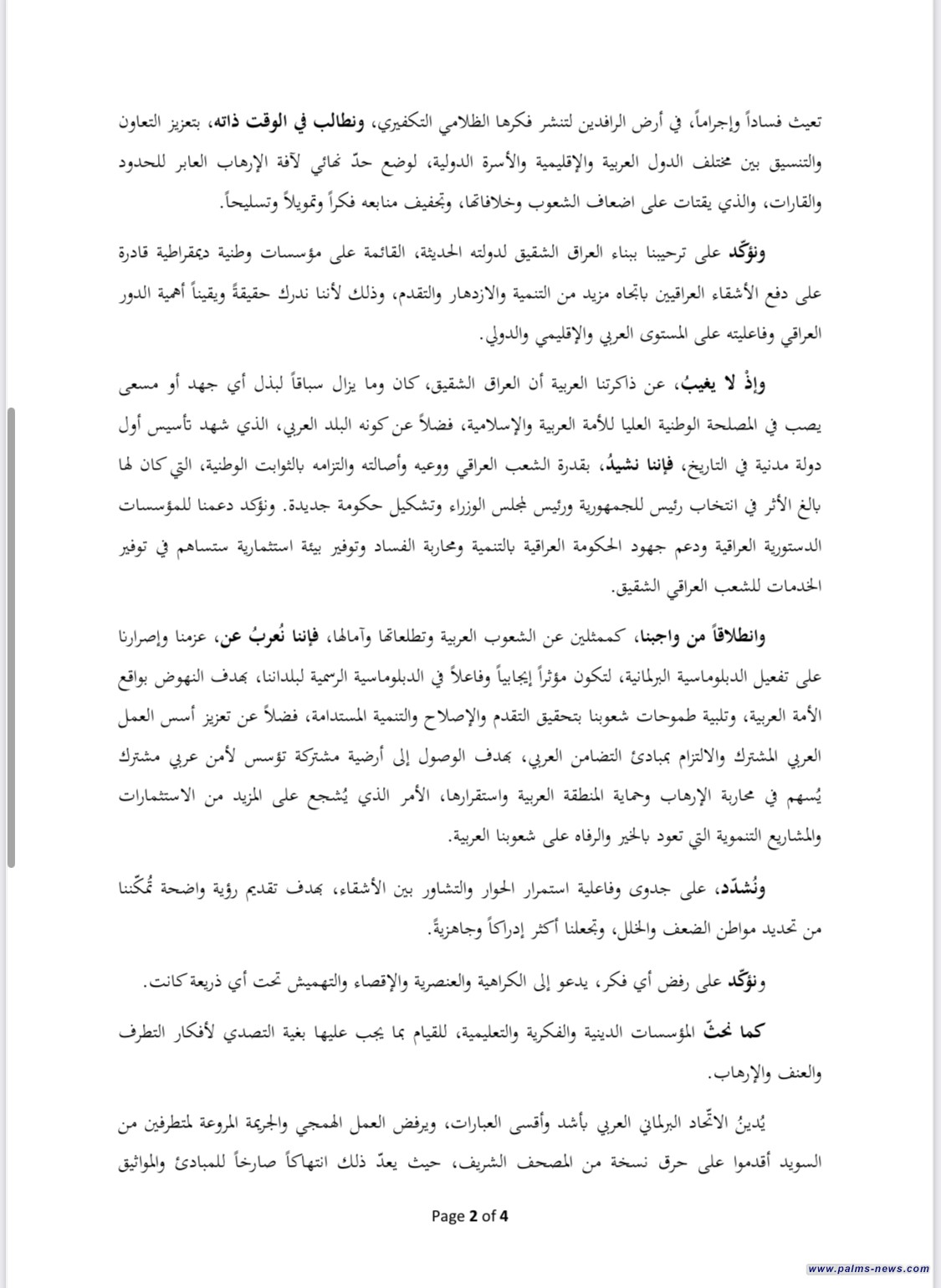 وشدد المؤتمرون "  على ترحيبهم ببناء العراق لدولته الحديثة، القائمة على مؤسسات وطنية ديمقراطية قادرة على دفع الأشقاء العراقيين باتجاه مزيد من التنمية والازدهار والتقدم، وذلك لأننا ندرك حقيقة ويقيناً أهمية الدور العراقي وفاعليته على المستوى العربي والإقليمي والدولي. وإذ لا يغيب عن ذاكرتنا العربية أن العراق الشقيق، كان وما يزال سباقاً لبذل أي جهد أو مسعى يصب في المصلحة الوطنية العليا للأمة العربية والإسلامية، فضلاً عن كونه البلد العربي، الذي شهد تأسيس أول دولة مدنية في التاريخ، فإننا نشيد، بقدرة الشعب العراقي ووعيه وأصالته والتزامه بالثوابت الوطنية، التي كان لها بالغ الأثر في انتخاب رئيس للجمهورية ورئيس مجلس الوزراء وتشكيل حكومة جديدة. وتؤكد دعمنا للمؤسسات الدستورية العراقية ودعم جهود الحكومة العراقية بالتنمية ومحاربة الفساد وتوفير بيئة استثمارية ستساهم في توفير الخدمات للشعب العراقي الشقيق. وانطلاقاً من واجبنا كممثلين عن الشعوب العربية وتطلعاتها وآمالها، فإننا نعرب عن عزمنا وإصرارنا على تفعيل الدبلوماسية البرلمانية، لتكون مؤثراً إيجابياً وفاعلاً في الدبلوماسية الرسمية لبلداننا، بهدف النهوض بواقع الأمة العربية، وتلبية طموحات شعوبنا بتحقيق التقدم والإصلاح والتنمية المستدامة، فضلاً عن تعزيز أسس العمل العربي المشترك والالتزام بمبادئ التضامن العربي، بهدف الوصول إلى أرضية مشتركة تؤسس لأمن عربي مشترك يسهم في محاربة الإرهاب وحماية المنطقة العربية واستقرارها، الأمر الذي يشجع على المزيد من الاستثمارات والمشاريع التنموية التي تعود بالخير والرفاه على شعوبنا العربية. وتؤكد على رفض أي فكر، يدعو إلى الكراهية والعنصرية والإقصاء والتهميش تحت أي ذريعة كانت. كما تحث المؤسسات الدينية والفكرية والتعليمية للقيام بما يجب عليها بغية التصدي لأفكار التطرف وتشدد على جدوى وفاعلية استمرار الحوار والتشاور بين الأشقاء، بهدف تقديم رؤية واضحة لمكننا تحديد مواطن الضعف والخلل، وتجعلنا أكثر إدراكاً وجاهزية. من والعنف والإرهاب. لدين الاتحاد البرلماني العربي بأشد وأقسى العبارات، ويرفض العمل الهمجي والجريمة المروعة المتطرفين من السويد أقدموا على حرق نسخة من المصحف الشريف، حيث بعد ذلك انتهاكا صارخاً للمبادئ والمواثيق الحقوقية الدولية، فضلاً عن كونه استفزازاً صارخاً لمشاعر المسلمين حول العالم، ناهيك عن استهدافه المتعمد للقيم الإسلامية المقدسة، وتغذية خطاب الكراهية والعنف، بذريعة حرية التعبير، بدلاً من تعزيز قيم الحوار والتسامج والتعايش، ونبذ العنف والتطرف وإقصاء الإنسان لأخيه الإنسان".