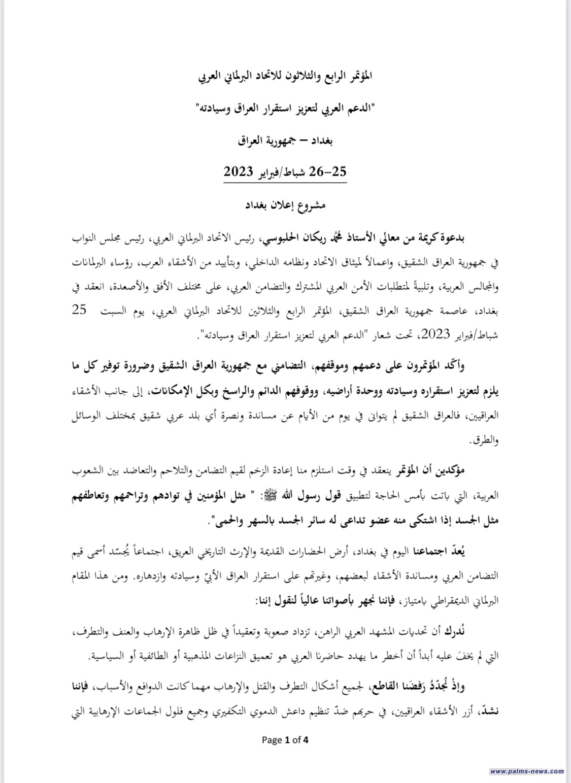 خرج المؤتمر الرابع والثلاثون للاتحاد البرلماني العربي المنعقد في بغداد، أمس السبت الخامس والعشرين من شباط، بمشروع عربي حمل عنوان "إعلان بغداد" تطبيقاً لميثاق الاتحاد ونظامه الداخلي، وبتأييد من كل  رؤساء البرلمانات والمجالس العربية، وتلبية المتطلبات الأمن العربي المشترك والتضامن العربي، على مختلف الأفق والأصعدة، بعدة مخرجات في نهاية الدورة.