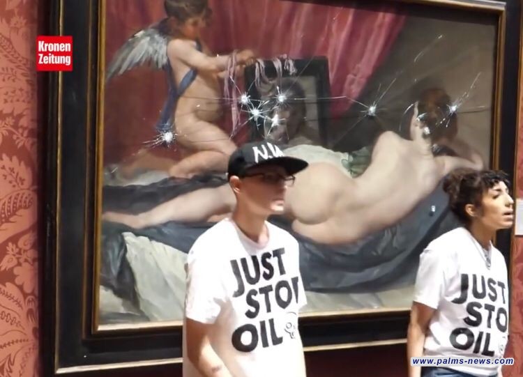 قام اثنان من نشطاء المناخ من حملة " فقط توقف عن النفط " Just Stop Oil في بريطانيا بكسر زجاج الأمان الخاص باللوحة الزيتية الشهيرة عالميًا "فينوس أمام المرآة" لدييغو فيلاسكيز في لندن.
