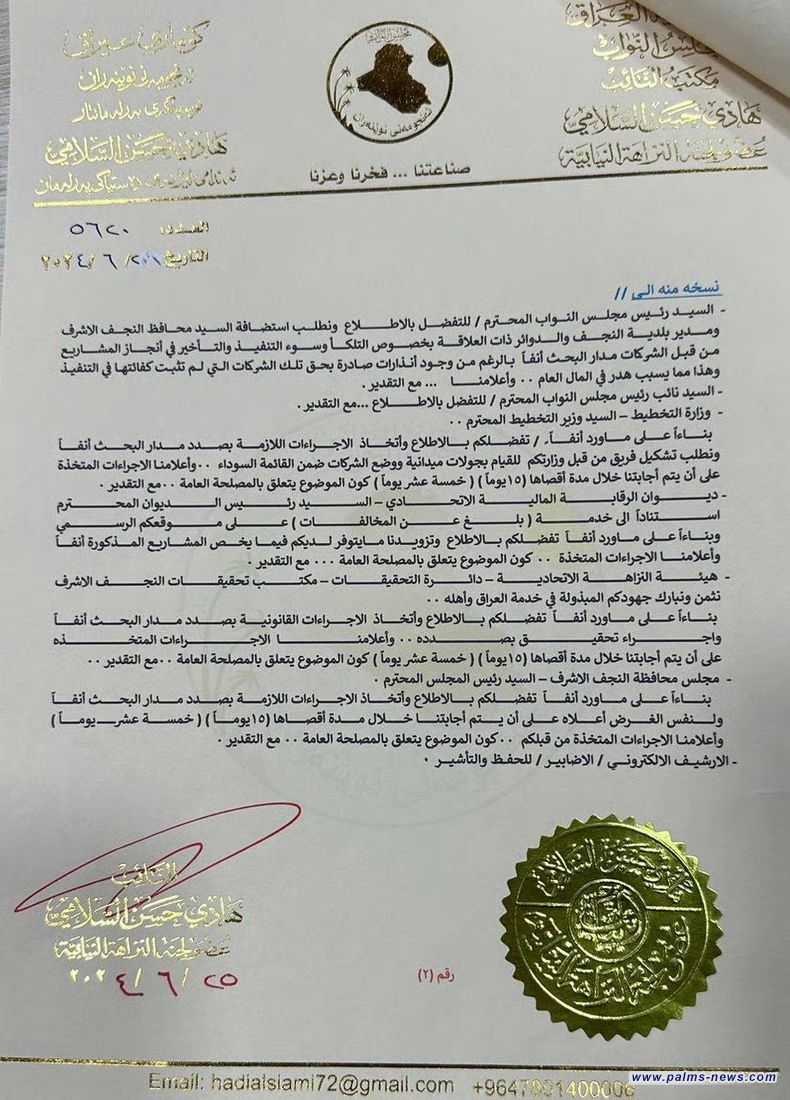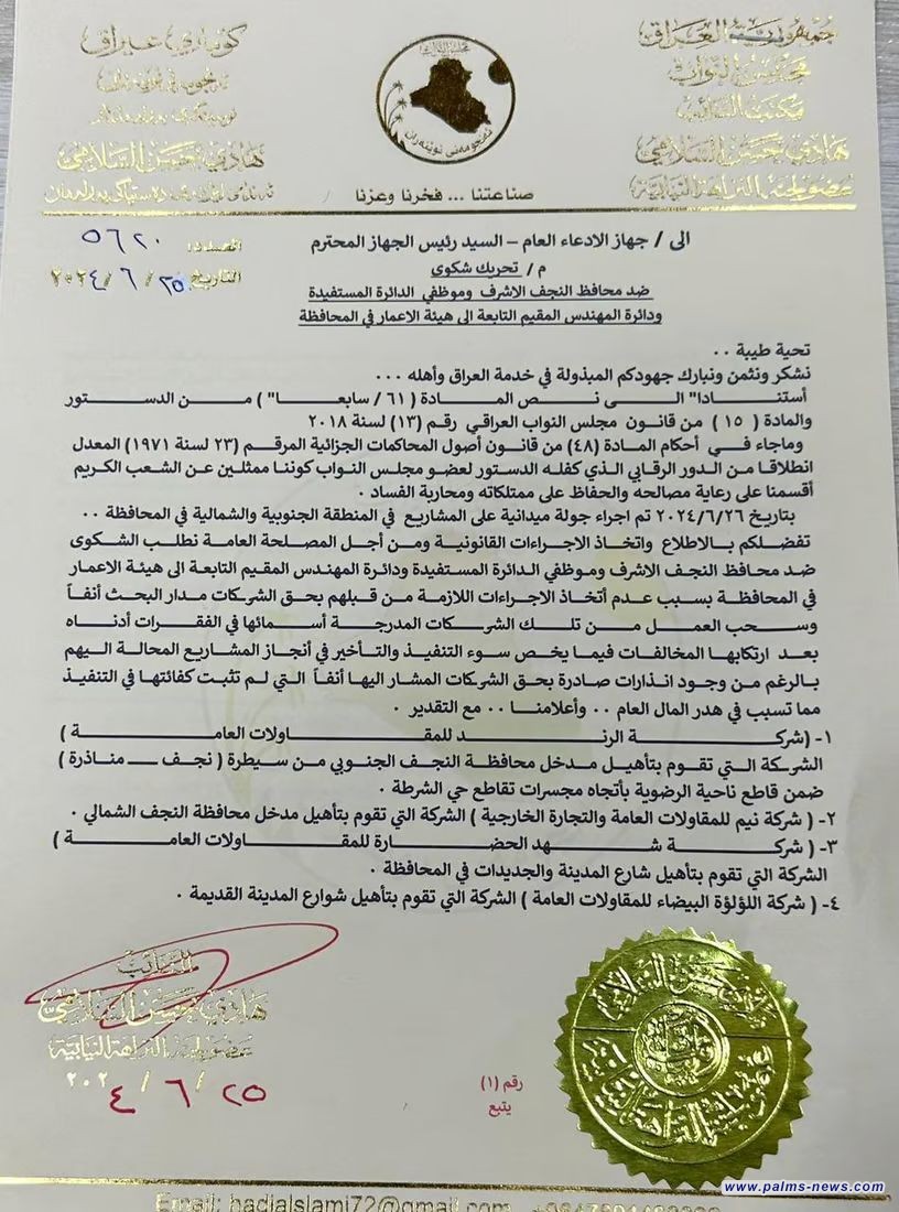قدم النائب هادي السلامي، اليوم الأحد الثلاثين من حزيران، دعوى قضائية ضد محافظ النجف يوسف كناوي، وذلك بسبب عدم سحب يد (4)شركات متلكئة ومتأخرة في تنفيذه مشارع في المحافظة، بحسب وثائق حصلت نشرها السلامي.