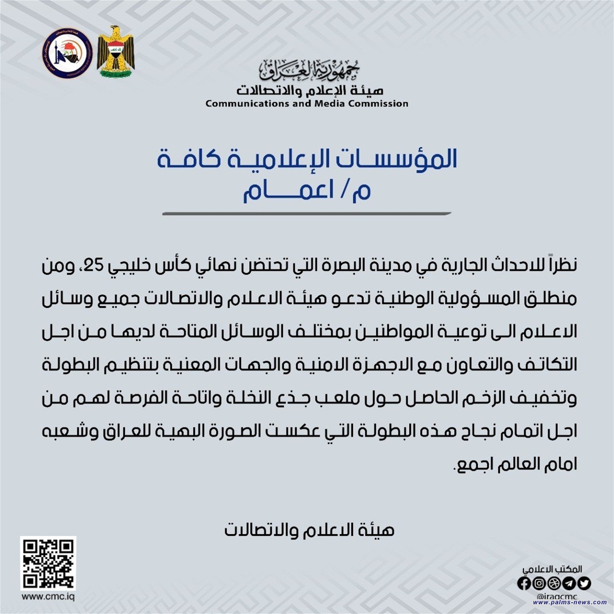 وذكر بيان للهيئة صادر من مكتبها الإعلامي جاء فيه ، انه "نظرا للاحداث الجارية في مدينة البصرة التي تحتضن نهائي كأس خليجي 25، ومن منطلق المسؤولية الوطنية تدعو هيئة الاعلام والاتصالات جميع وسائل الاعلام إلى توعية المواطنين بمختلف الوسائل المتاحة لديهـا مـن اجـل التكاتف والتعاون مع الاجهزة الامنية والجهات المعنية بتنظيم البطولة".