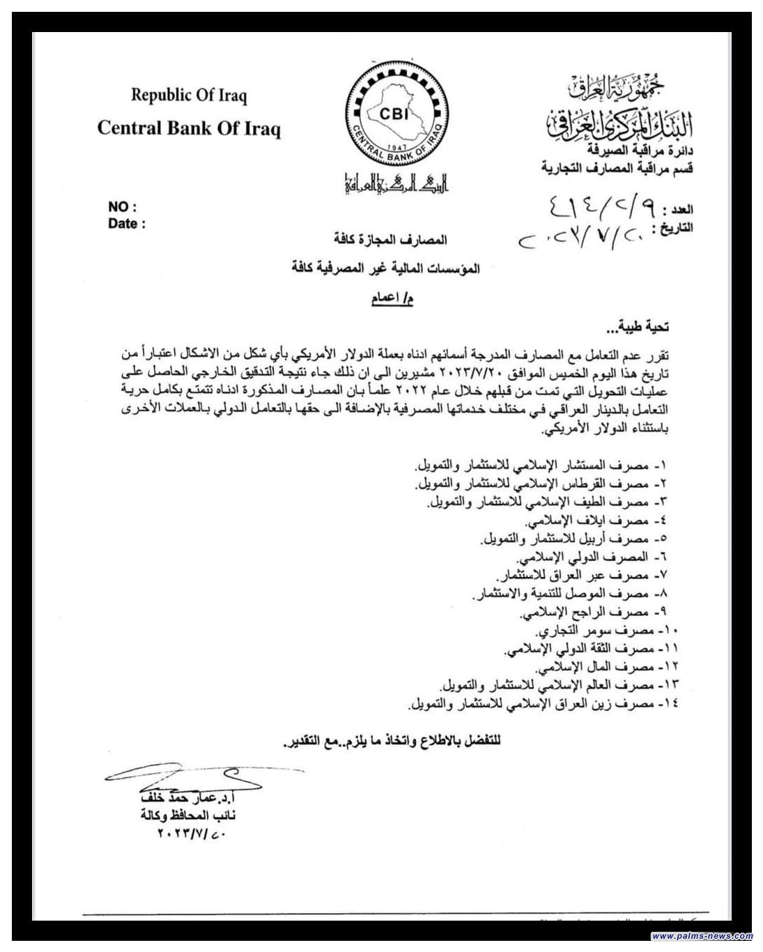 وثيقة.. البنك المركزي يعمم قرار حرمان 14 مصرفاً عراقياً من التعامل بالدولار الأمريكي