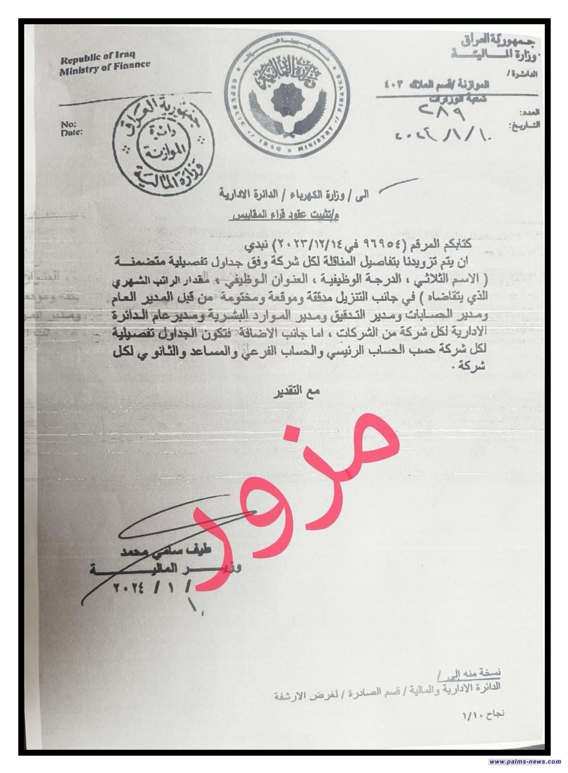 وأوضحت الوزارة في بيان تلقته نخيل نيوز نسخة منه، أن الكتاب المتداول غير صحيح ولم يتم إصداره من قبل قسم الملاك في دائرة الموازنة، مؤكدة على عدم وجود أي توقيع أو تاريخ رسمي له.