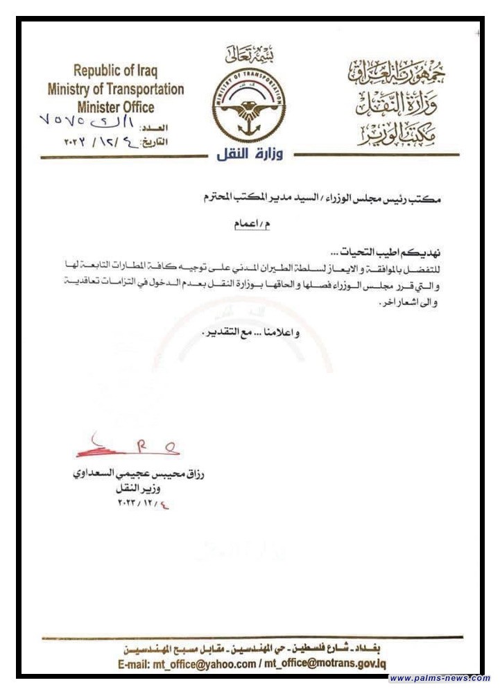 ووفقا لكتاب رسمي مُذيّل بتوقيع وزير النقل رزاق السعداوي، بتاريخ الأول من شهر كانون الأول الجاري، فقد طلب من مكتب رئيس مجلس الوزراء بالموافقة والإيعاز إلى سلطة الطيران المدني على توجيه المطارات التابعة لها كافة، والتي قرر مجلس الوزراء فصلها والحاقها بوزارة النقل بعدم الدخول في التزامات تعاقدية والى اشعار آخر.
