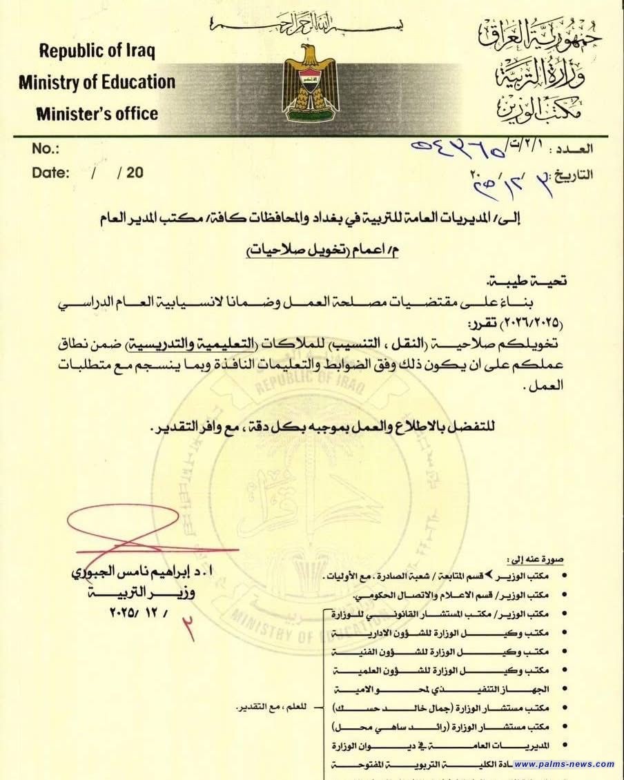 أعلن وزير التربية منح المديرين العامين صلاحية اتخاذ قرارات النقل والتنسيب للملاكات التعليمية والتدريسية، وفق الضوابط والتعليمات النافذة.