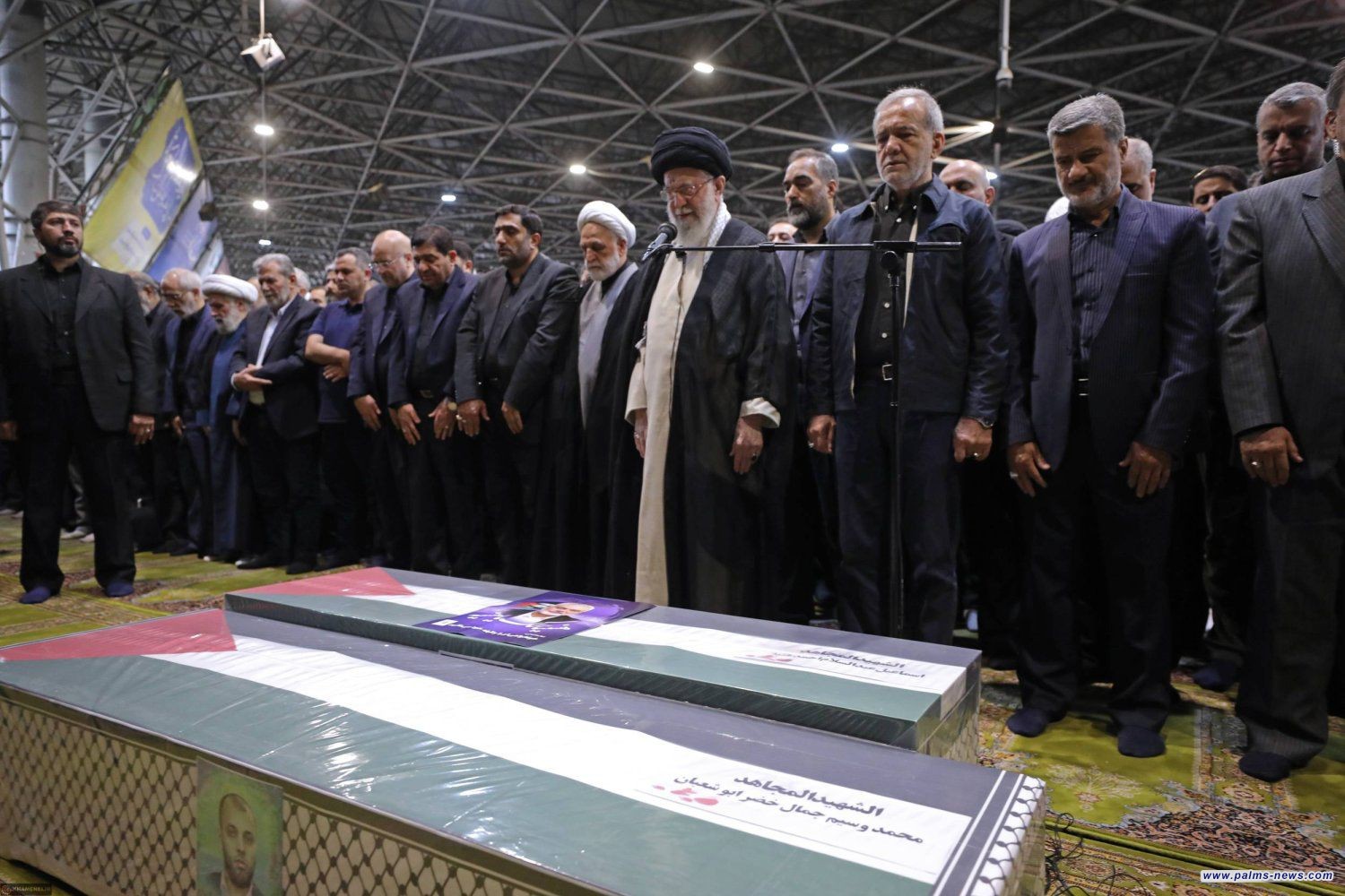 وأقام المرشد الإيراني علي خامنئي صلاة الجنازة على هنية وحارسه الشخصي، الذي قتل معه في الهجوم، حيث وقف خامنئي أمام نعش هنية في جامعة طهران، بينما وقف الرئيس الإيراني الجديد مسعود بزشكيان إلى جانبه.