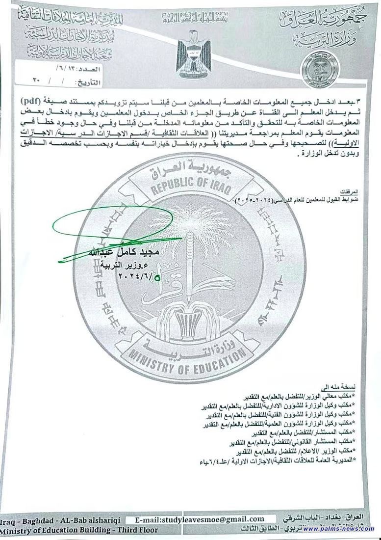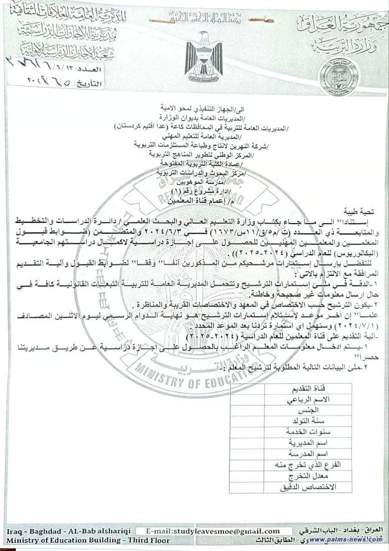 أعلنت وزارة التربية العراقية، اليوم الأربعاء الخامس من حزيران ، فتح باب التقديم للمعلمين التربويين والمهنيين ممن يرومون الحصول على إجازة دراسية لإكمال البكالوريوس والدراسة الجامعية.