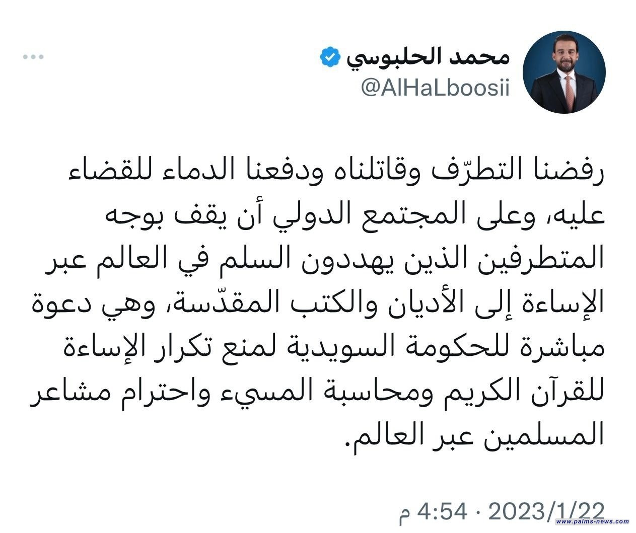 حيث جاء هذا في تغريدة للحلبوسي عبر صفحته الرسمية على "تويتر"، قائلا: "رفضنا التطرّف وقاتلناه ودفعنا الدماء للقضاء عليه، وعلى المجتمع الدولي أن يقف بوجه المتطرفين الذين يهددون السلم في العالم عبر الإساءة إلى الأديان والكتب المقدّسة".