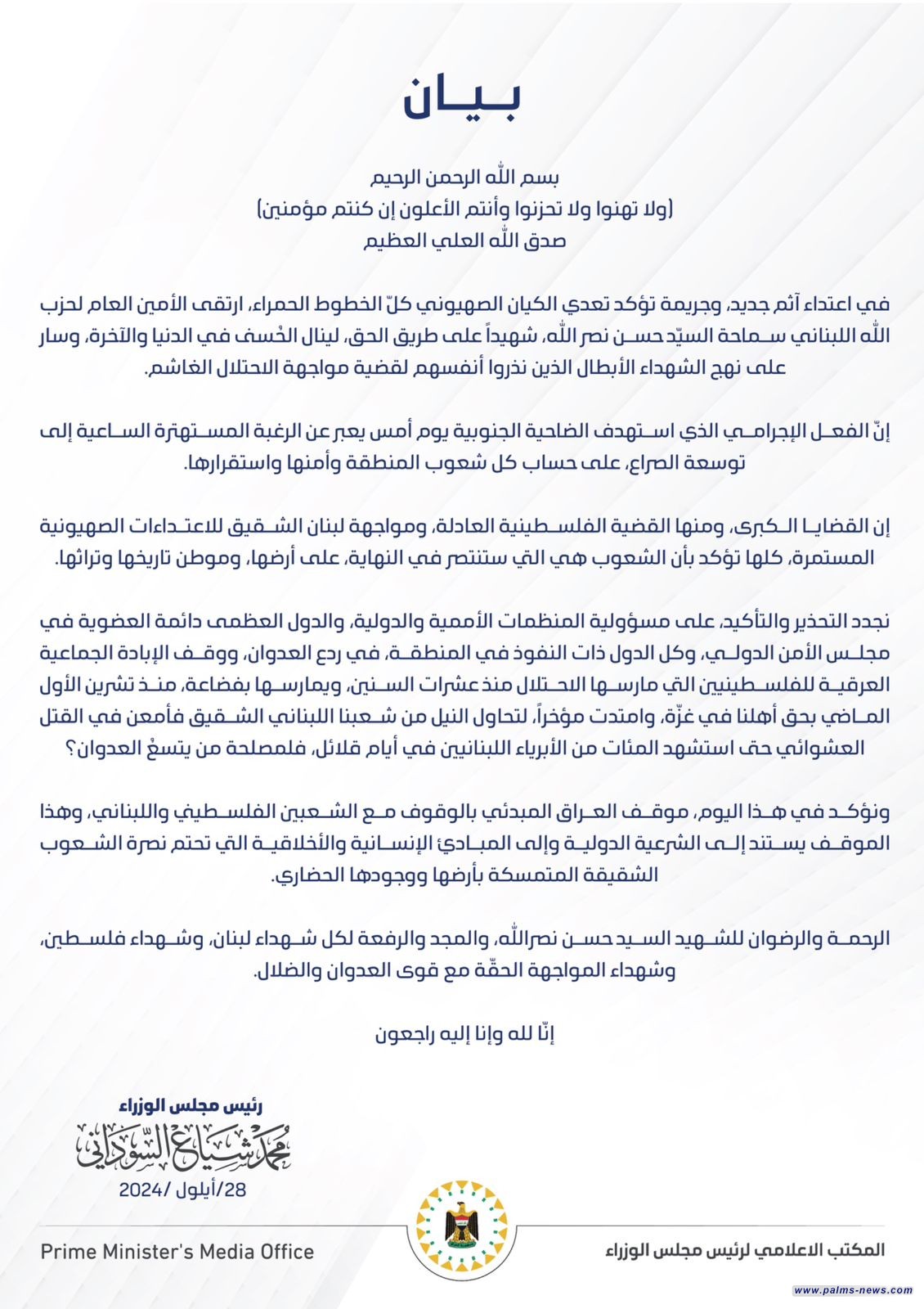 أصدر المكتب الإعلامي لرئيس مجلس الوزراء محمد شياع السوداني بياناً أدان فيه اعتداء الكيان الصهيوني الذي أسفر عن استشهاد الأمين العام لحزب الله السيد الشهيد حسن نصر الله.