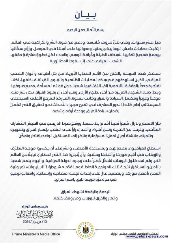 قال رئيس مجلس الوزراء العراقي محمد شياع السوداني، في منشور له عبر منصة (x) اليوم الاثنين العاشر من حزيران، إنه قبل عشر سنوات، وفي ظلِّ ظروف مُلتبسة، ودعمٍ من قوى الشّر والكراهية في العالم، ارتكبت عصابات داعش الإرهابية جريمتها وعدوانها على أهلنا في الموصل، ورُوِّع سكّانها بهجمةٍ همجيةٍ تغذيها الأهداف الدنيئة وخُرافة الوهم، والعداء لكل خطوةِ مُشرقةِ حققها الشعب العراقي على إثر سقوط الدكتاتورية.
