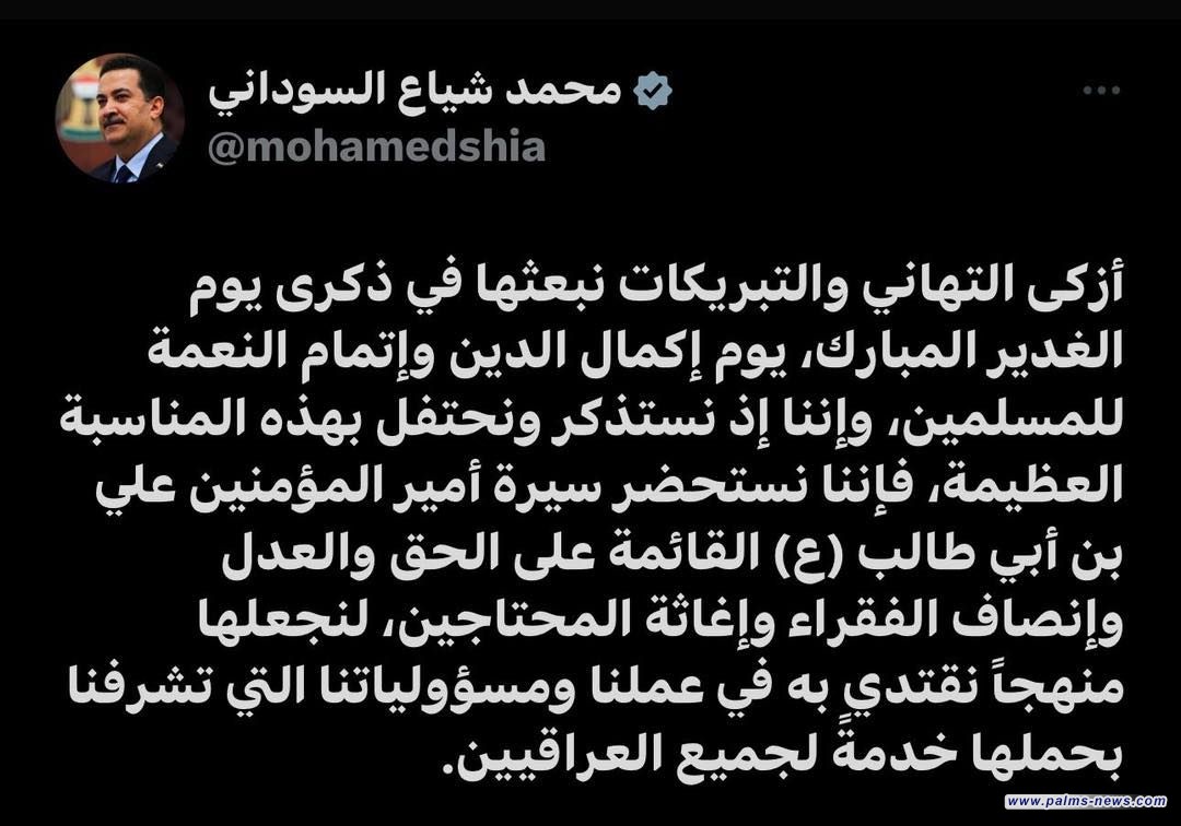 وقال السوداني، في تغريدة له على منصة "تويتر" : "أزكى التهاني والتبريكات نبعثها في ذكرى يوم الغدير المبارك، يوم إكمال الدين وإتمام النعمة للمسلمين".