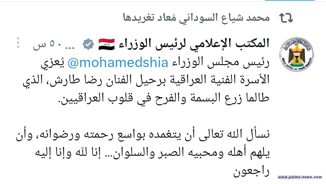قدم رئيس الوزراء محمد شياع السوداني، اليوم الاثنين، التعازي للأسرة الفنية العراقية برحيل الفنان رضا طارش.