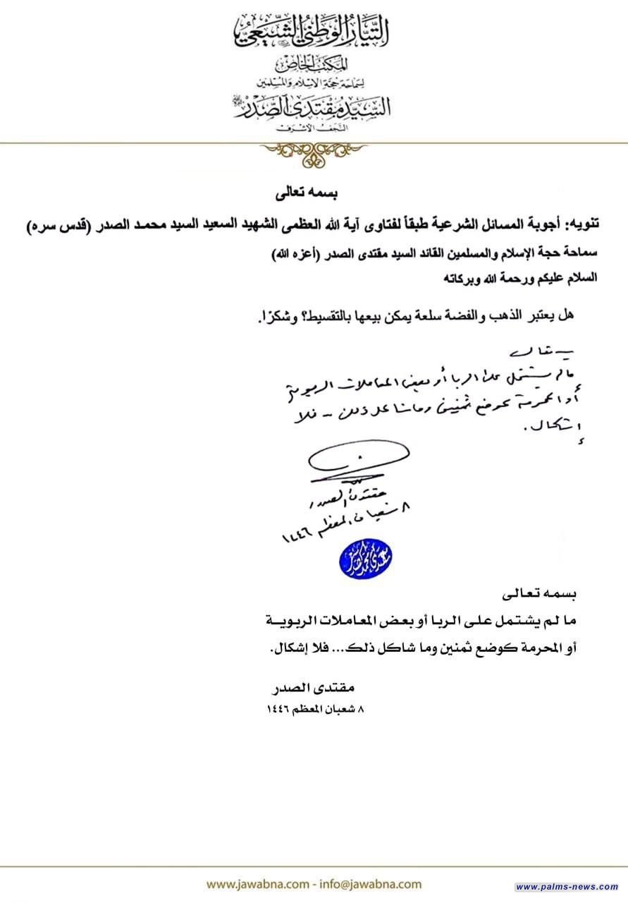 وذكر السيد الصدر في رد له على استفتاء حول "هل يعتبر الذهب والفضة سلعة يمكن بيعها بالتقسيط"، "مالم يشتمل على الربا او بعض المعاملات الربوية او المحرمة كوضع ثمنين وما شاكل ذلك،.. فلا اشكال".