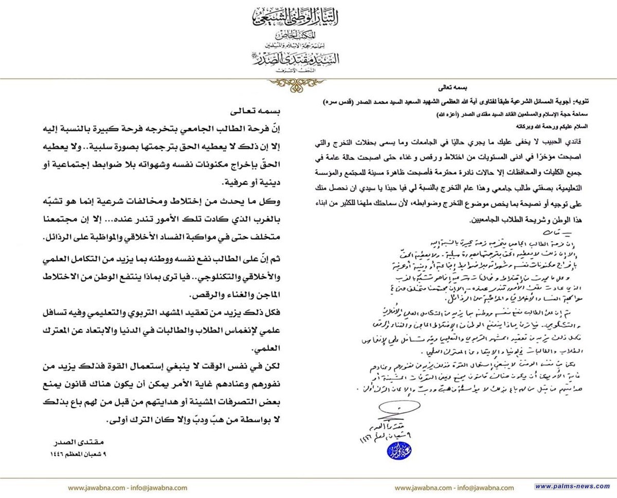 كما اكد السيد الصدر في رد له على استفتاء بشأن (ما يجري حاليا في الجامعات وما يسمى بحفلات التخرج التي أصبحت مؤخرا في ادنى المستويات من اختلاط ورقص وغناء حتى أصبحت حالة عامة في جميع الكليات والمحافظات الا حالات نادرة محترمة، فاصبحت ظاهرة مسيئة للمجتمع والمؤسسة التعليمية)، ان "فرحة الطالب الجامعي بتخرجه فرحة كبيرة بالنسبة إليه، إلا إن ذلك لا يعطيه الحق بترجمتها بصورة سلبية.. ولا يعطيه الحق بإخراج مكنونات نفسه وشهواته بلا ضوابط إجتماعية أو دينية أو عرفية".