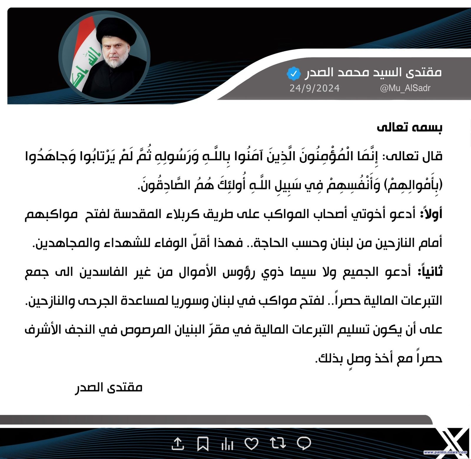 دعا زعيم التيار الوطني الشيعي مقتدى الصدر، اليوم الثلاثاء، أصحاب المواكب على طريق كربلاء المقدسة إلى استقبال النازحين اللبنانيين، فيما وجه دعوة إلى أصحاب رؤوس الأموال من غير الفاسدين لجمع التبرعات المالية حصرا بغية فتح المواكب في لبنان وسوريا.