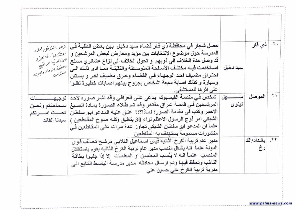 واظهرت وثيقة نشرتها منصات مقربة من التيار الوطني الشيعي، وتابعتها وكالة نخيل عراقي ، والتي تتضمن موقفا حول ما يحصل بسبب الانتخابات في عموم العراق والتي تقدم بشكل دوري الى السيد الصدر على ما يبدو، ان شجارا في محافظة ذي قار وقع بين بعض الطلبة بسبب خلاف على دعم مرشحين للانتخابات وقد وصل الخلاف الى نزاع عشائري مسلح بين عوائلهم بالأسلحة الثقيلة والخفيفة ما أدى لاحتراق مضيفين واصابة 7 اشخاص".