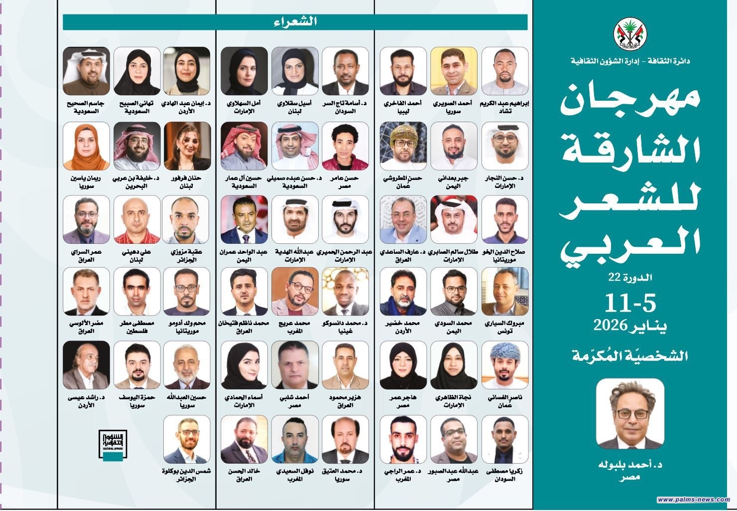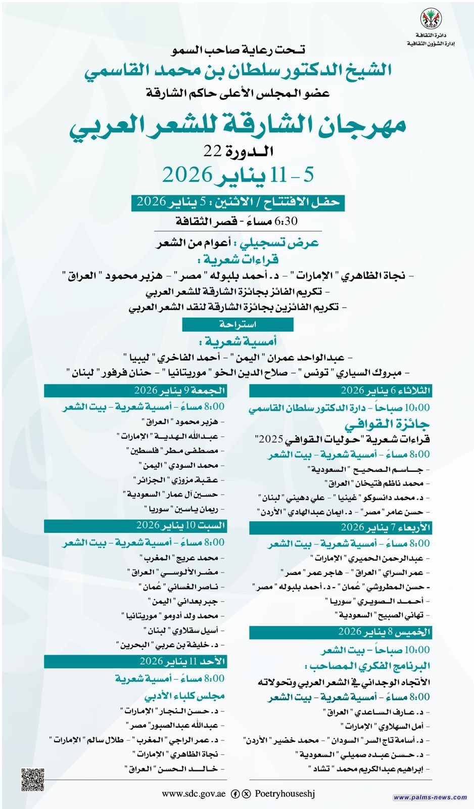 تشهد إمارة الشارقة بدولة الإمارات العربية المتحدة اليوم الاثنين ٥ كانون الثاني انطلاق فعاليات مهرجان الشارقة للشعر العربي برعاية كريمة