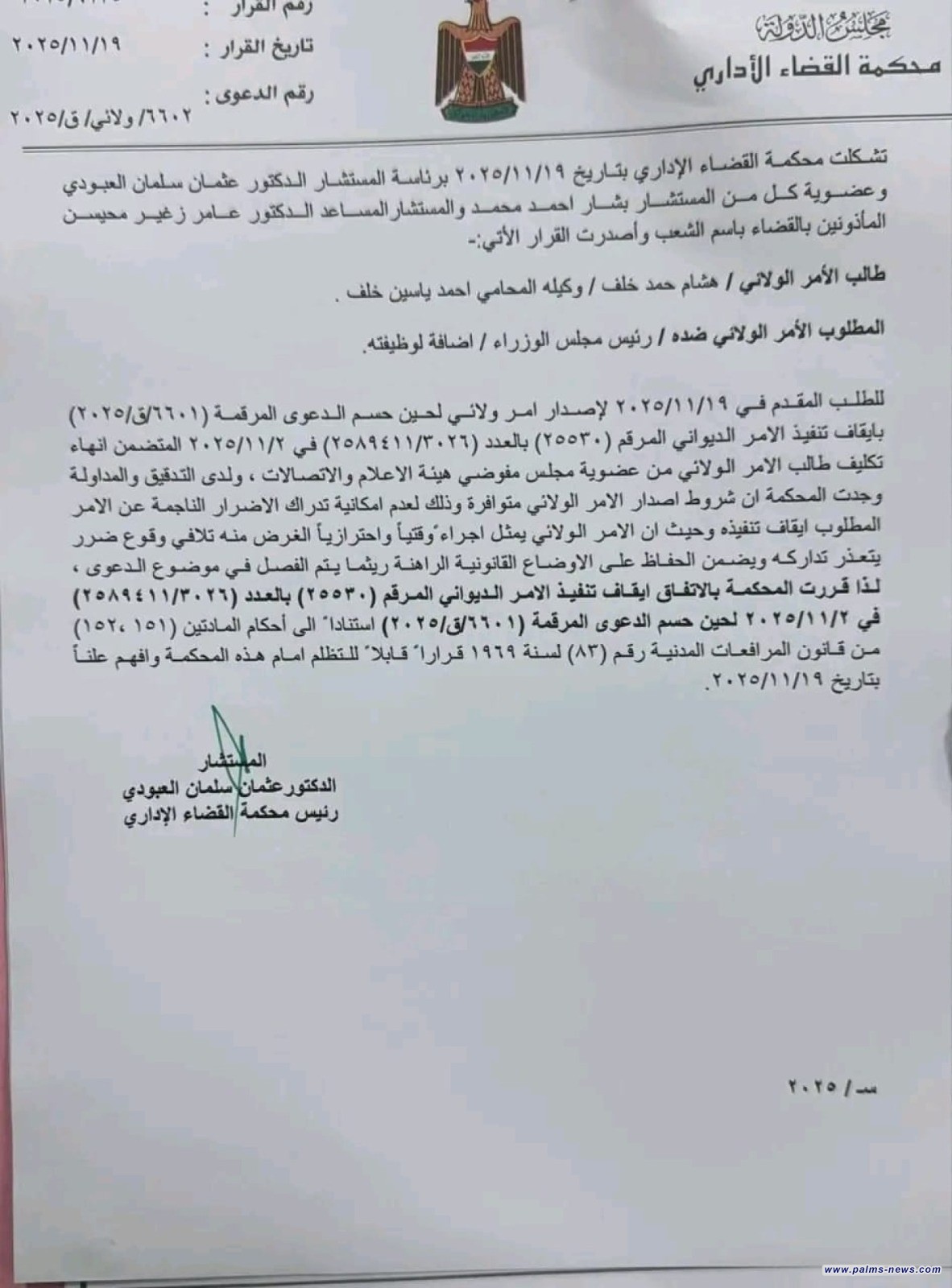 وأصدرت محكمة القضاء الإداري، اليوم الأربعاء، أمراً بـ "إيقاف إنهاء تكليف هشام الركابي من عضوية مجلس أمناء هيئة الإعلام والاتصالات"، والذي صدر عن رئيس مجلس الوزراء محمد شياع السوداني سابقاً.