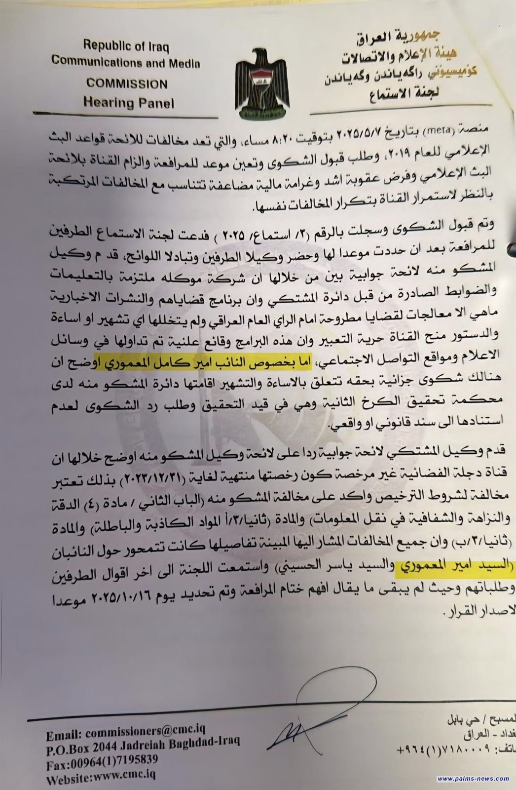 النائب أمير المعموري يعلن صدور عقوبات بحق قناة دجلة الفضائية بعد تجاوزها عليها