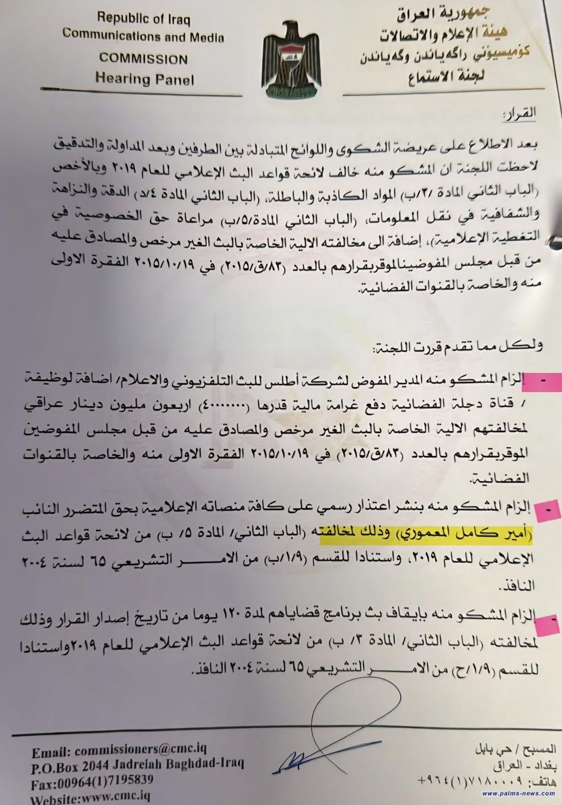 وأوضح المعموري أن الهيئة قررت إلزام القناة بنشر اعتذار رسمي على جميع منصاتها الإعلامية للنائب، وفرض غرامة مالية قدرها أربعون مليون دينار تُدفع للهيئة لمخالفة القناة ضوابط البث غير المرخّص والمصادق عليها من قبل مجلس المفوضين بقرارهم المرقم (83/ق/2015) في 19 تشرين الأول 2015.