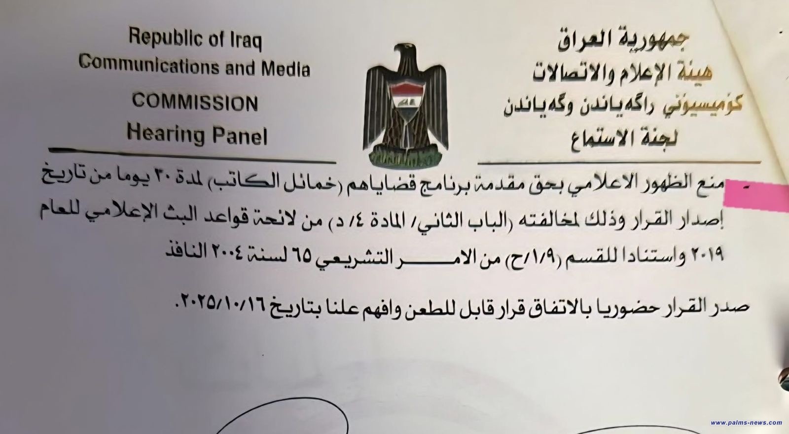 كما شملت العقوبات، إيقاف بث برنامج “قضاياهم” لمدة 120 يوماً من تاريخ صدور القرار، استناداً إلى لائحة قواعد البث الإعلامي لعام 2019 والأمر التشريعي رقم 65 لسنة 2004 النافذ، إضافة إلى منع مقدمة البرنامج خمائل الكاتب من الظهور الإعلامي لمدة 30 يوماً لمخالفتها الضوابط الإعلامية.