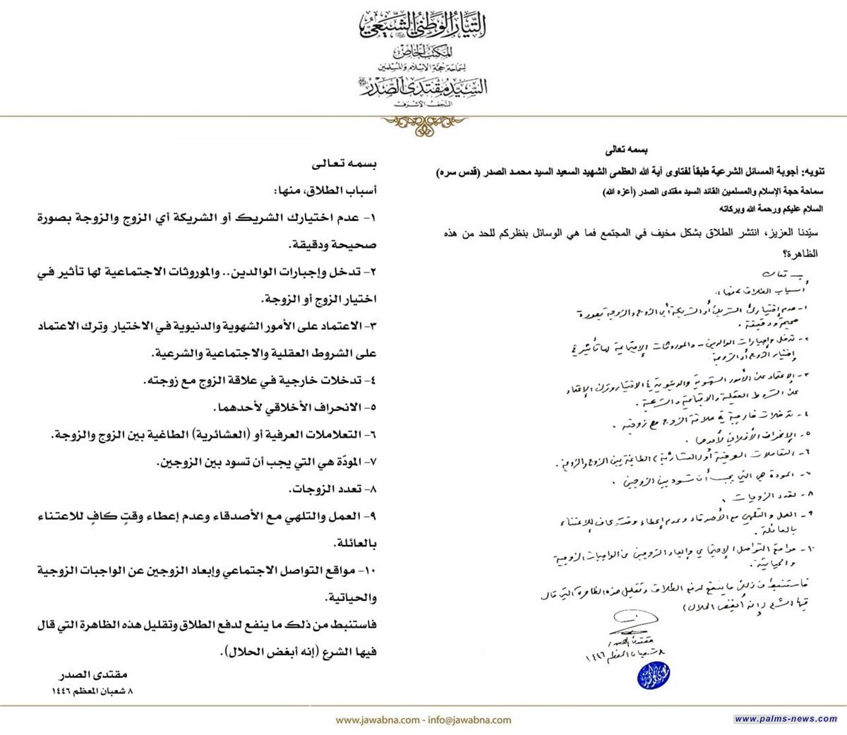 وادناه نص رد السيد الصدر على الاستفتاء: