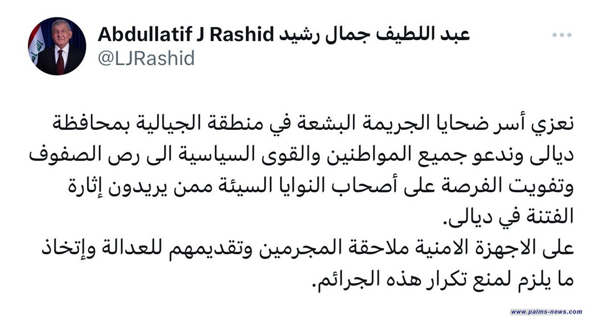 وقال رئيس الجمهورية في تغريدة عبر تويتر"نعزي أسر ضحايا الجريمة البشعة في منطقة الجيالية بمحافظة ديالى"، داعيا إلى "جميع المواطنين والقوى السياسية الى رص الصفوف وتفويت الفرصة على أصحاب النوايا السيئة ممن يريدون إثارة الفتنة في محافظة ديالى".