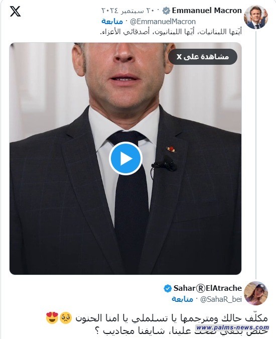 فيما سخرت ناشطة أخرى من كلمة ماكرون بالقول "مكلف حالك ومترجمها للغة العربية يا تسلملي يا أمنا الحنون، خلص بكيفي ضحك علينا، شايفنا مجاديب".