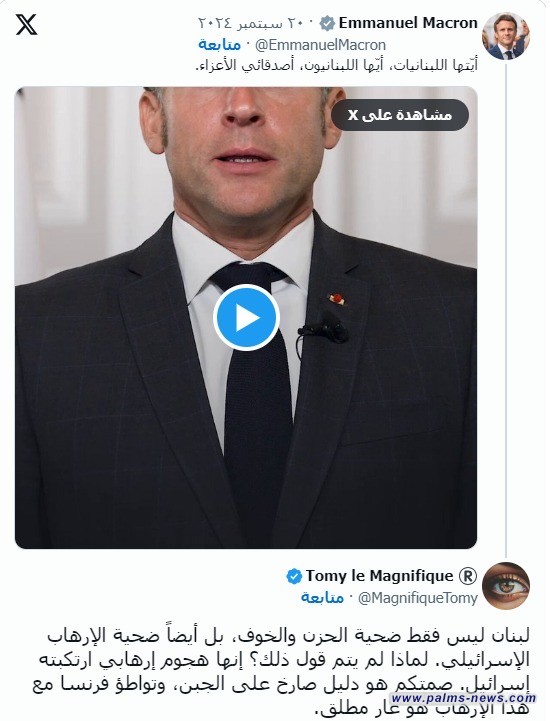 واعتبر أحد الناشطين ماكرون رئيسا جبانا. فقد كتب قائلا" "لبنان ليس فقط ضحية الحزن والخوف، بل أيضاً ضحية الإرهاب الإسرائيلي. لماذا لم يتم قول ذلك؟ صمتكم هو دليل صارخ على الجبن، وتواطؤ فرنسا مع هذا الإرهاب هو عار مطلق".