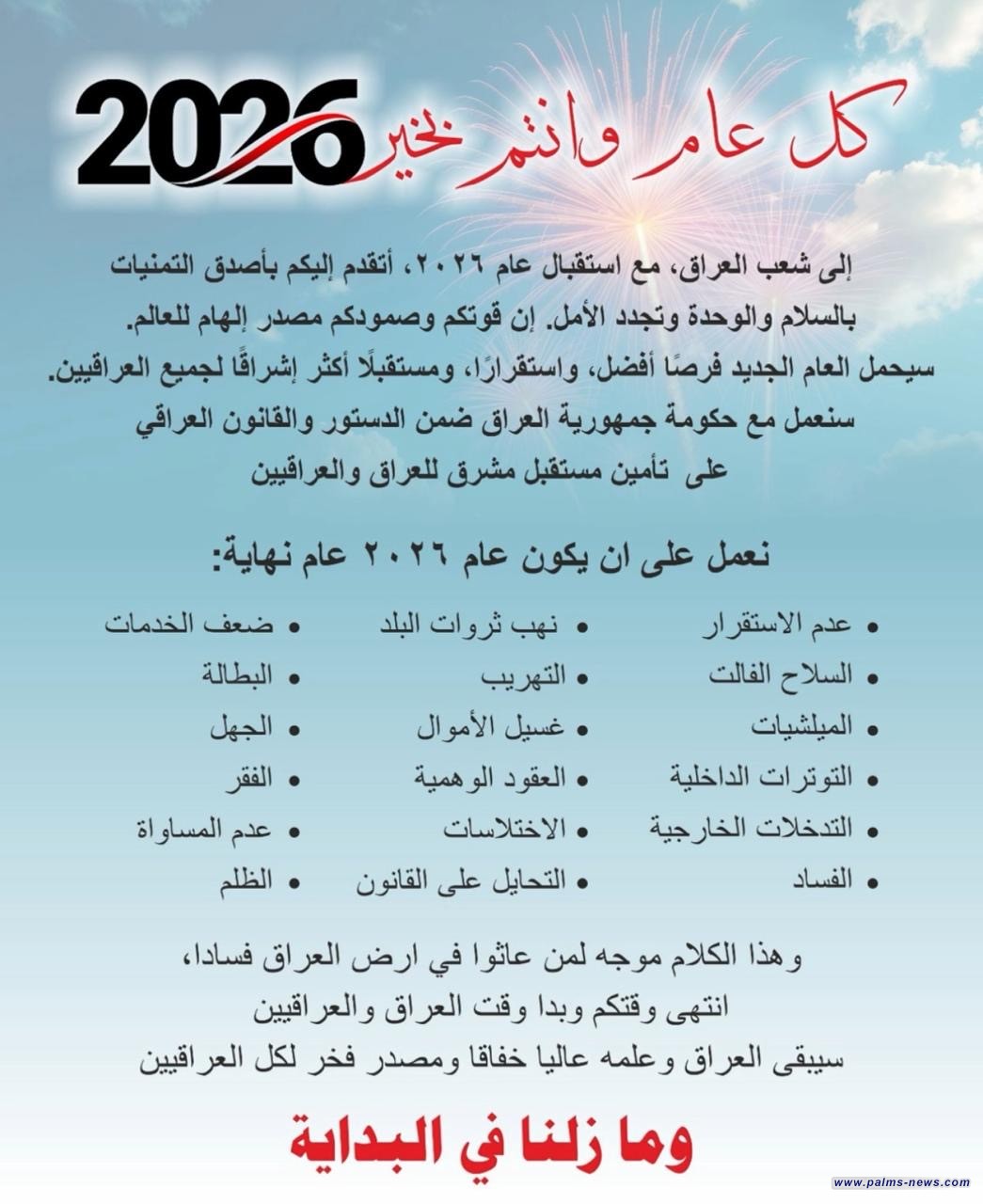 وأضاف سافايا، "نعمل على ان يكون عام ٢٠٢٦ عام لنهاية، عدم الاستقرار، ونهاية نهب ثروات البلد، وضعف الخدمات، والسلاح المنفلت، والتهريب، والبطالة، والميلشيات، وغسيل الأموال، والجهل، والتوترات الداخلية، والعقود الوهمية، والفقر، وعدم المساواة، والفساد، والتحايل على القانون، والظلم، والتدخلات الخارجية، والاختلاسات".