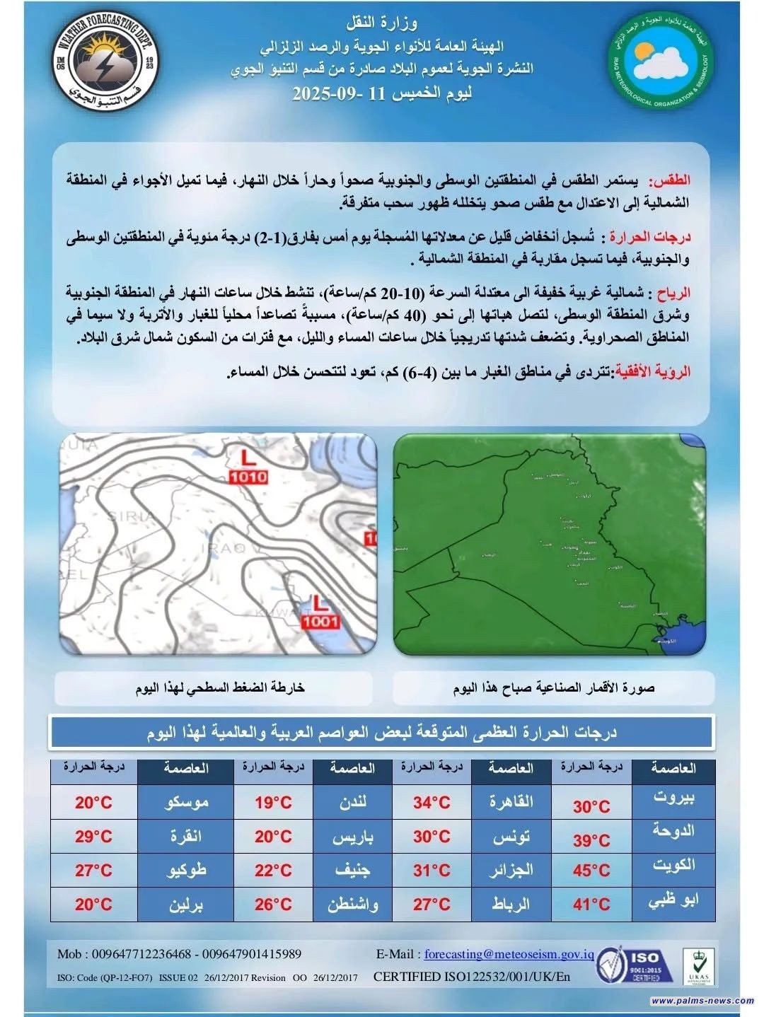 تشهد مناطق العراق اليوم أجواءً معتدلة تصل فيها درجات الحرارة العظمى إلى 44 مئوية، فيما ترافق الطقس رياح شمالية مثيرة للغبار والأتربة في بعض المناطق، بحسب بيان للأرصاد الجوية.
