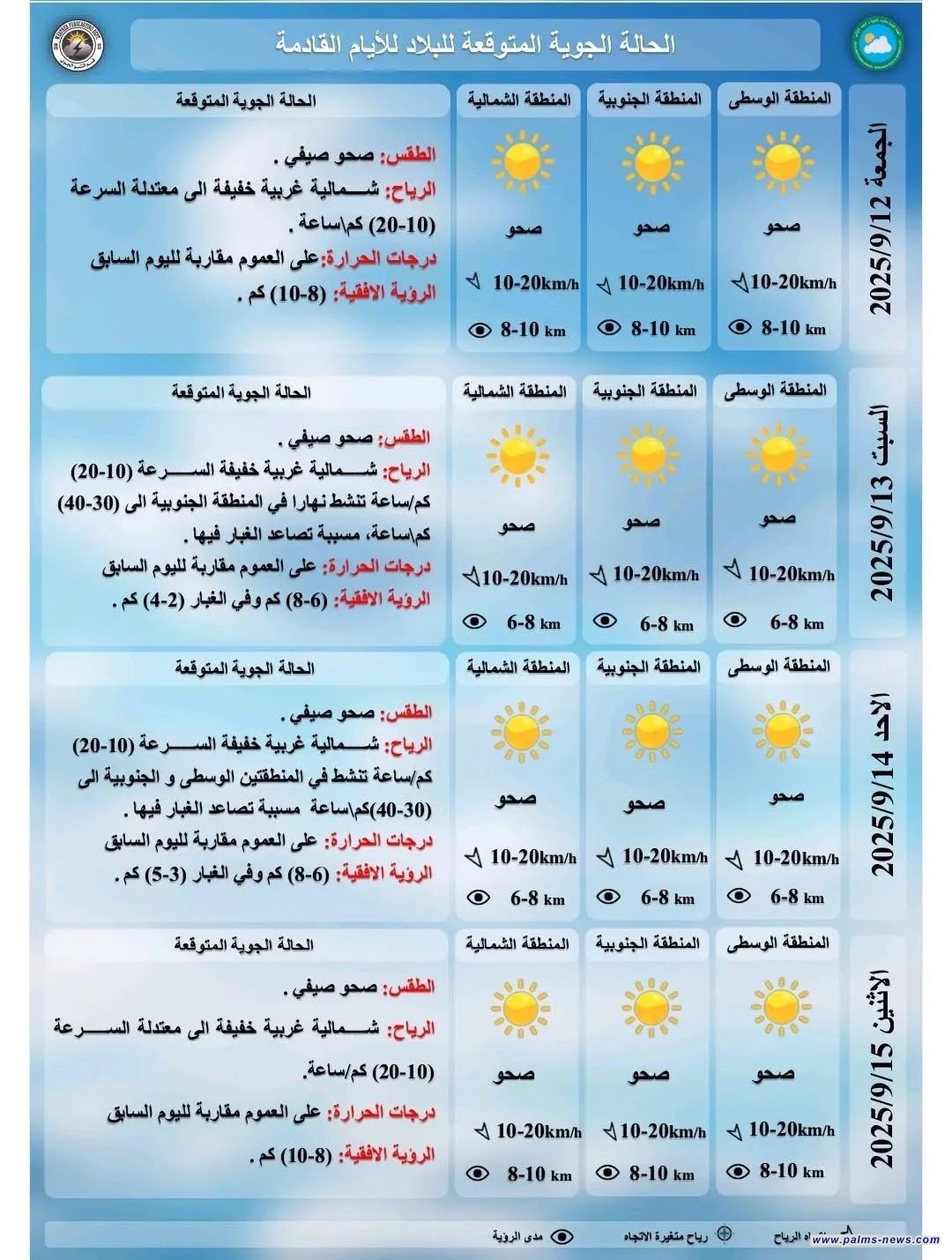 وأكدت الهيئة، أن الأجواء تبقى مستقرة بشكل عام مع تفاوت في درجات الحرارة بين المحافظات، مشيرة إلى أن الرياح ستؤثر على مدى الرؤية الأفقية في المناطق المكشوفة