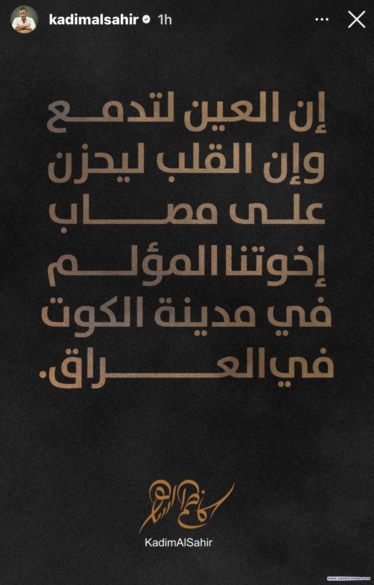 وقال الساهر بمنشور له على صفحته في "انستغرام" بخاصية "الستوري"إن "العين لتدمع وأن القلب ليحزن على مصاب اخوتنا المؤلم في مدينة الكوت بالعراق".