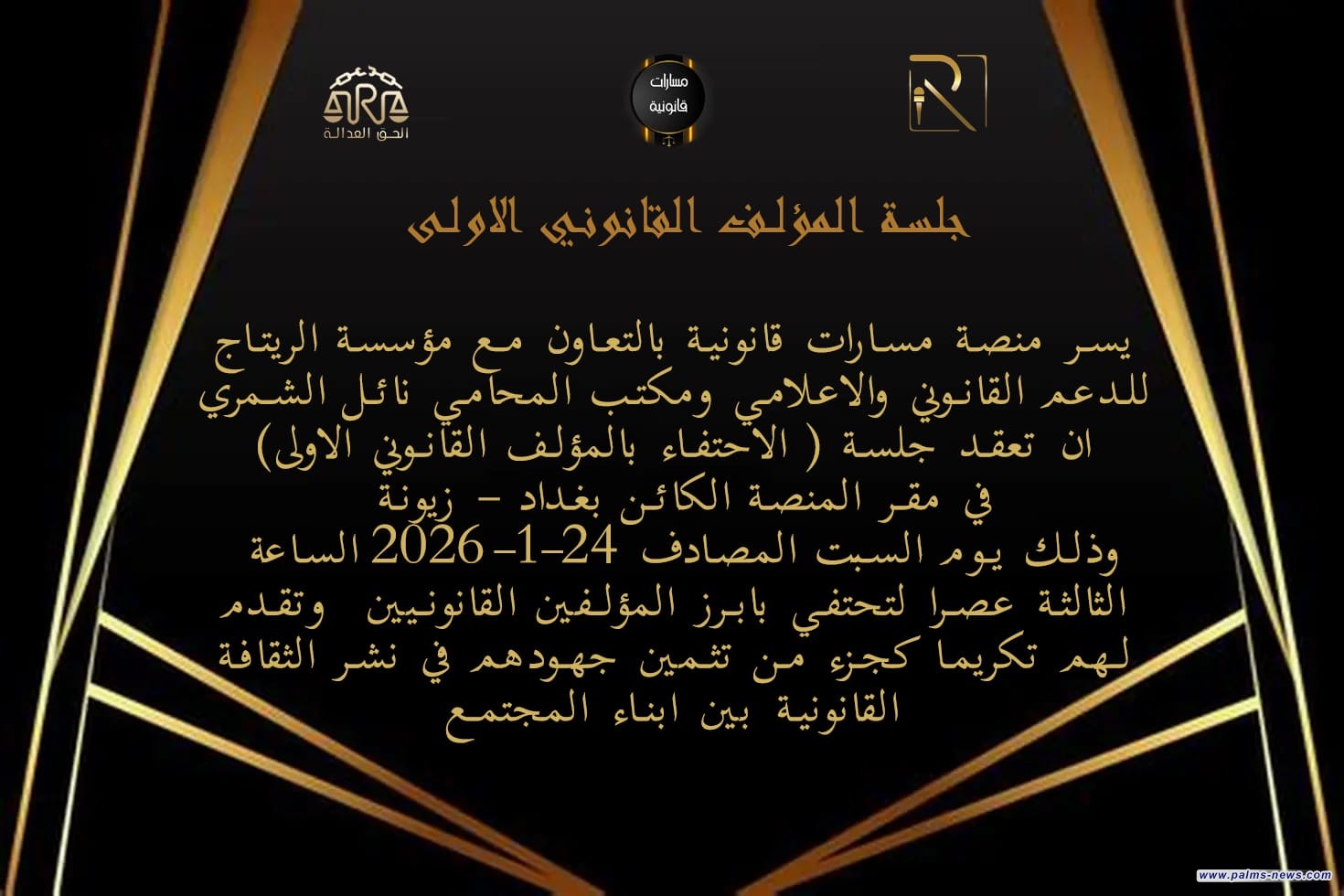 عقدت اليوم السبت في مقر مكتب مسارات قانونية للمحاماة والدعم القانوني ، جلسة لتكريم عدد من المؤلفين في القانون وأصحاب المكتبات القانونية ، حيث أدارها المحامي وليد الجبر رئيس اللجنة الثقافية في نقابة المحامين ومسؤول مكتب مسارات قانونية ، أكد فيها على أن هذه الجلسة دعوة مسموعة لنقابة المحامين العراقيين الموقرة لعقد مؤتمر على مستوى العراق لتكريم المؤلفين القانونيين.