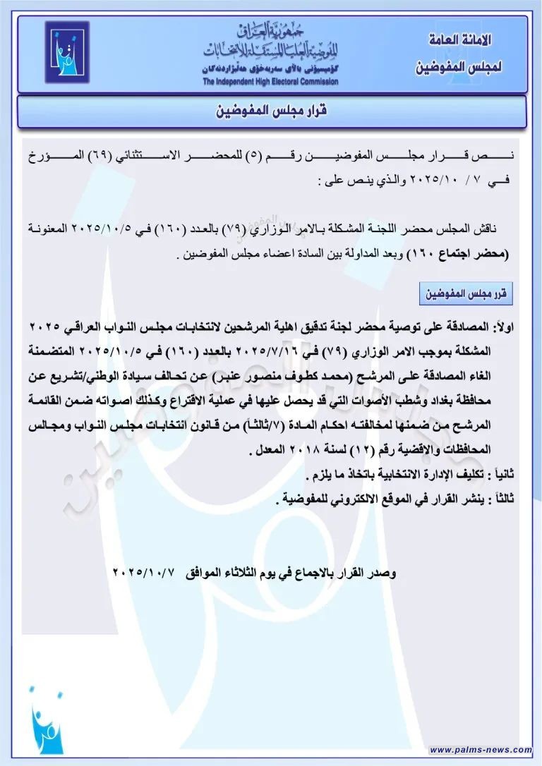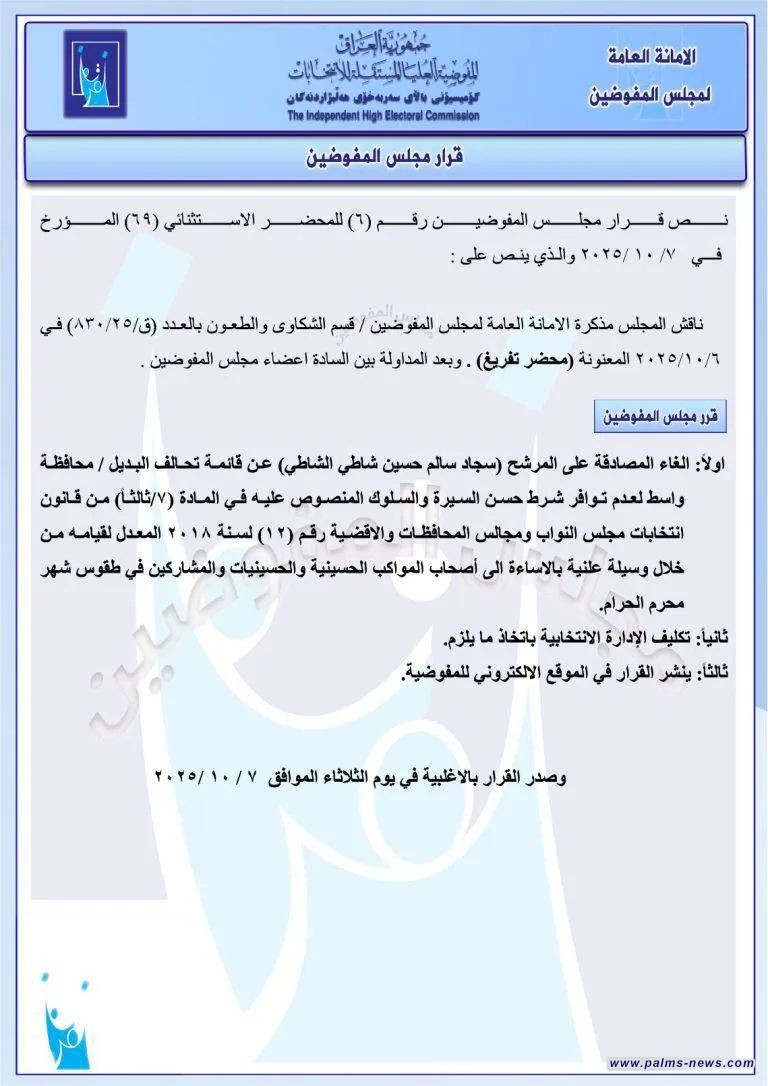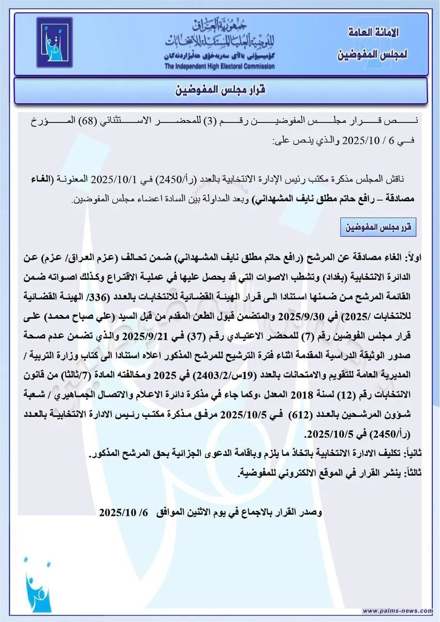 مفوضية الانتخابات تقرر استبعاد سجاد سالم ومحمد الدايني ورافع المشهداني من السباق الانتخابي.