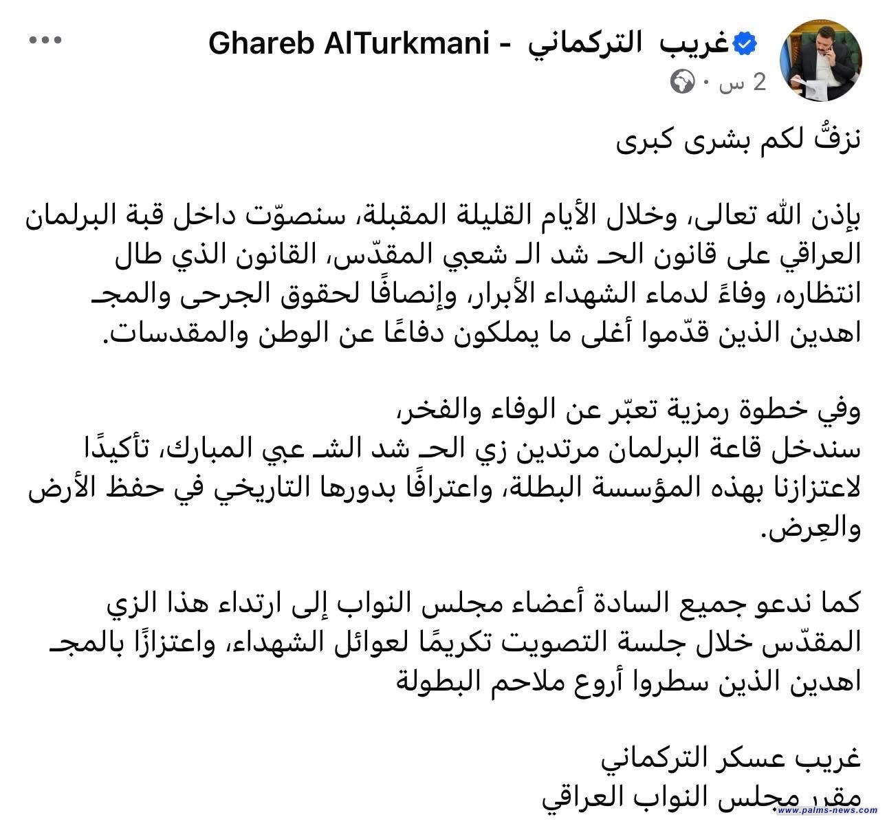 مقرر مجلس النواب غريب عسكر التركماني: سنصوت على قانون الحـ ،ـشد الشـ ،ـعبي خلال الأيام المقبلة.