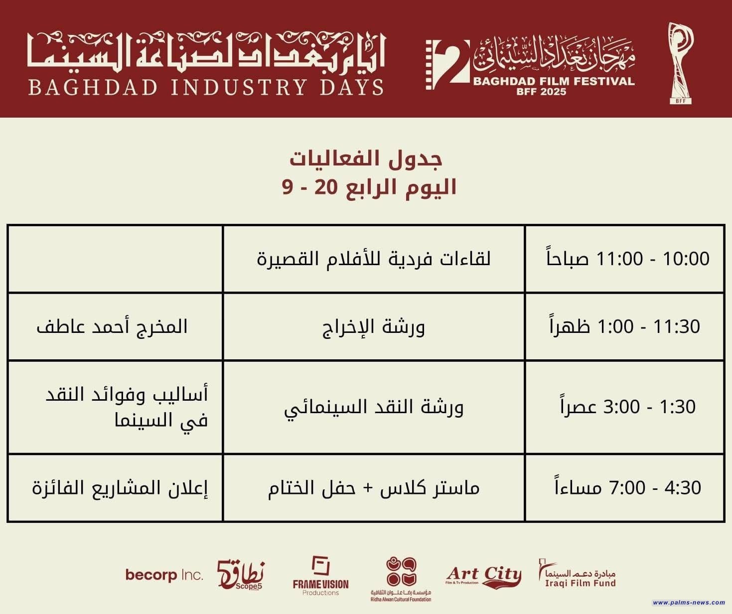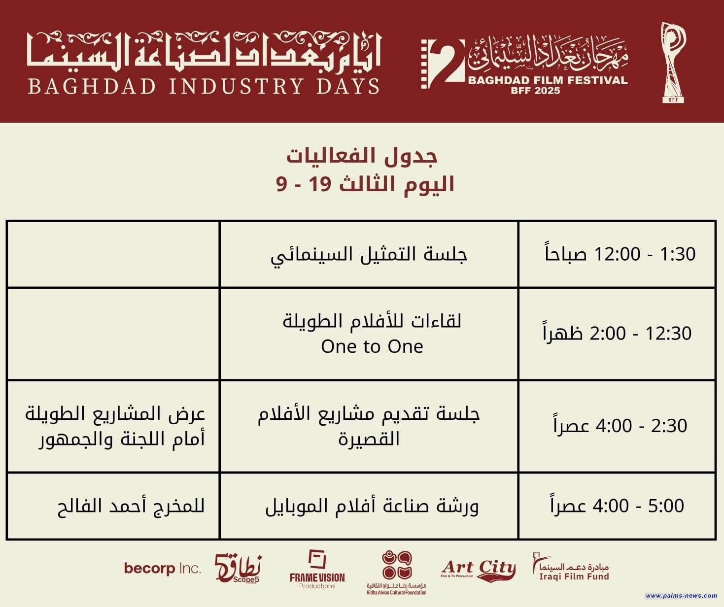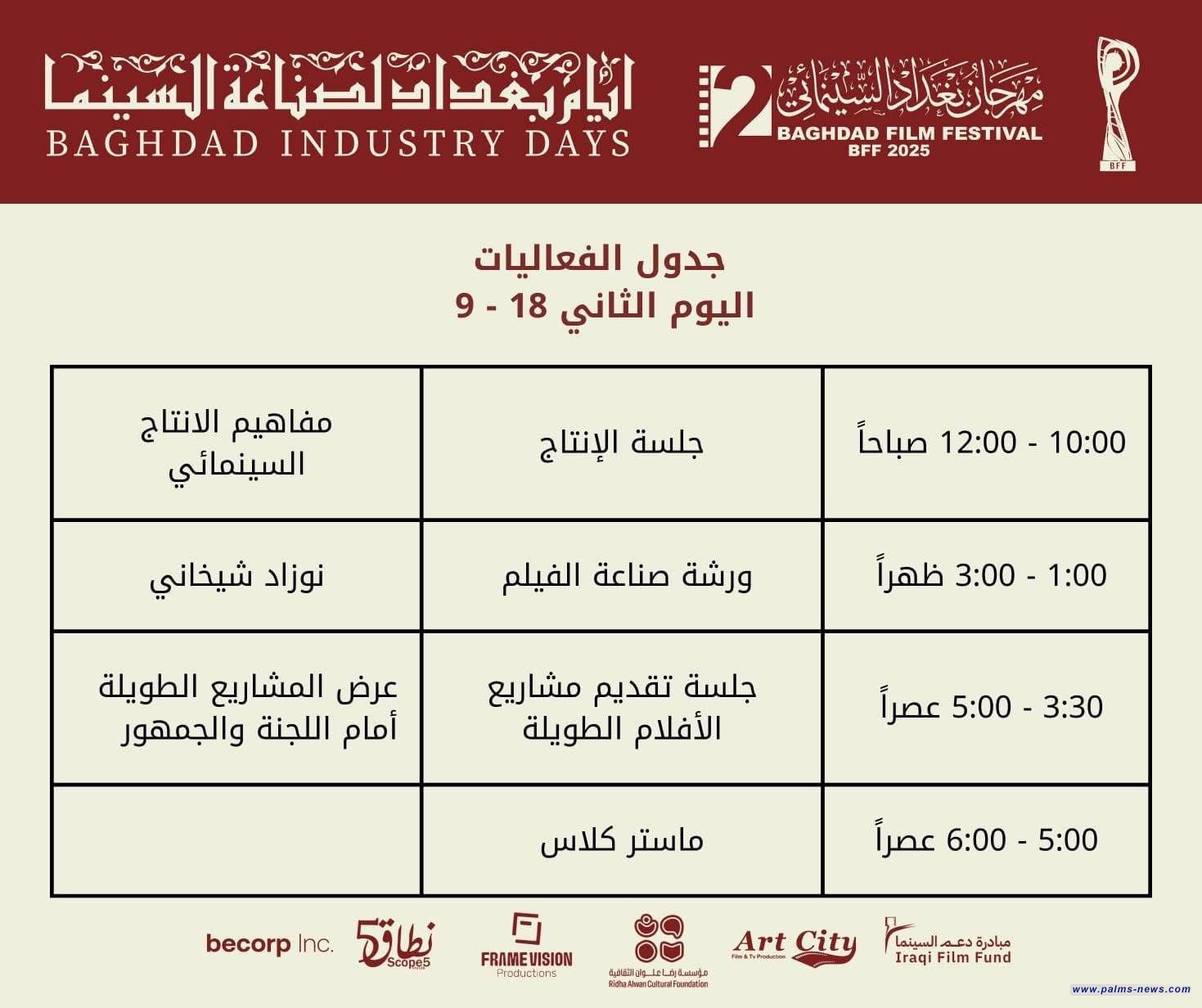 نخيل نيوز تنشر جدول فعاليات أيام بغداد لصناعة السينما بمهرجان بغداد السينمائي بدورته الثانية.