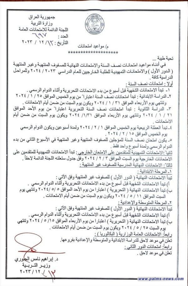 وذكر المكتب الاعلامي للوزارة في بيانٍ صدر عنهُ اليوم تابعته وكالة نخيل عراقي، إن اللجنة الدائمة للامتحانات حددت بدء الامتحانات الشفهية قبل أسبوع من عملية بدء الامتحانات التحريرية وأثناء الدوام الرسمي ، إذ تكون الامتحانات الخاصة بالمراحل الابتدائية اعتباراً من يوم الخميس الموافق الـ25 من شهر كانون الثاني المقبل وتنتهي يوم الأربعاء الـ31 من نفس الشهر ، على أن يكون يوم السبت من ضمن أيام الامتحانات.